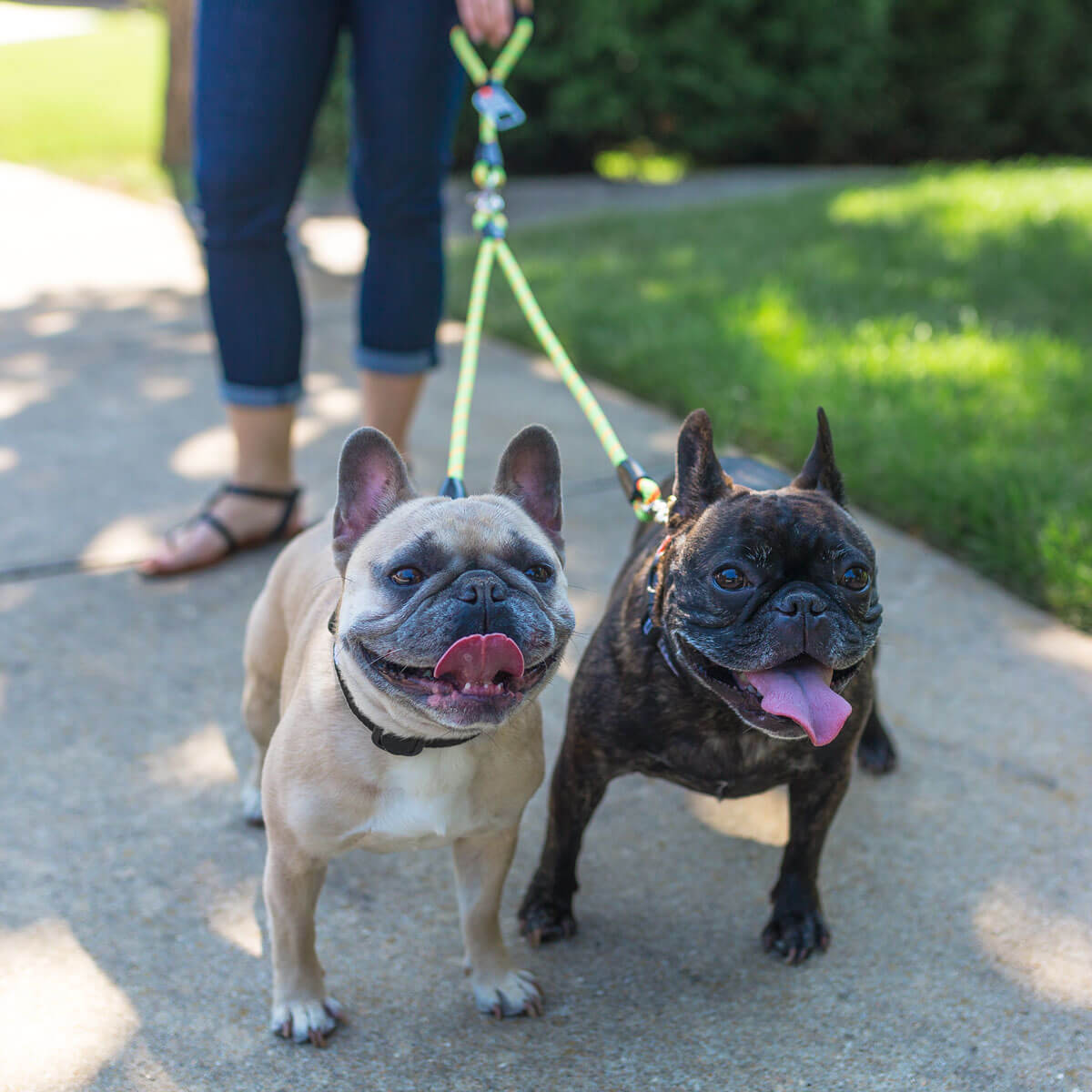 All of our dog leashes are handmade in the USA from rock climbing rope. Our 2′ splitter is best for dogs of all sizes. It can be attached to any of our dog leashes but works particularly great with our 2′ traffic lead. Can be used with two dogs of the same size or two completely different-sized dogs.